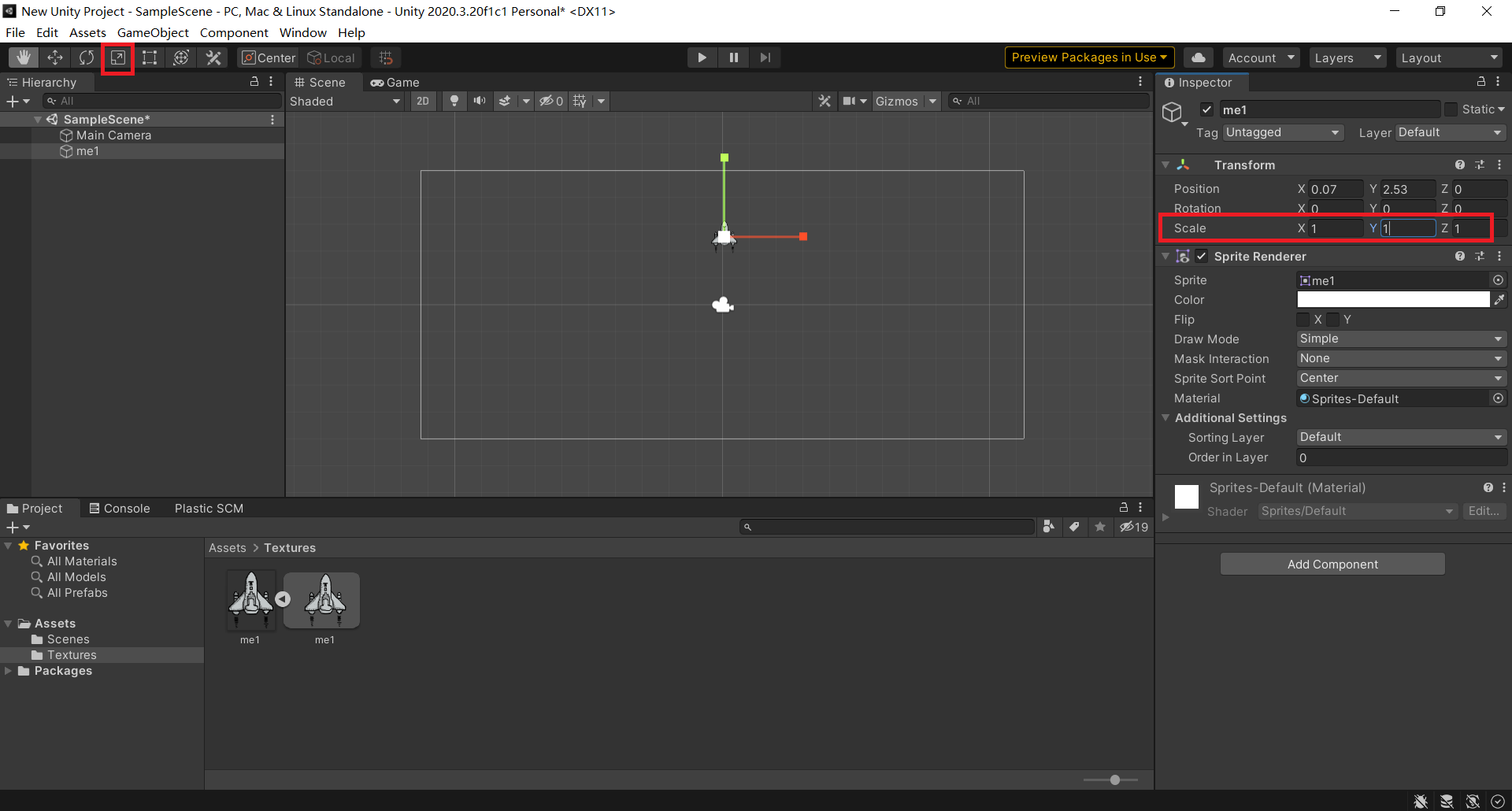 红轴缩放水平方向,绿轴缩放竖直方向,拖动中间的方框可以等比例缩放。可以通过Scale属性控制